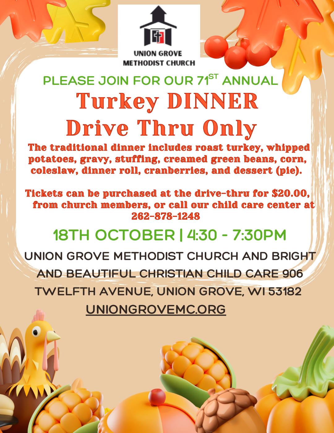 Join us on Saturday, October 18th for our seventy first Turkey Dinner! We will be serving the traditional dinner of roast turkey, whipped potatoes, gravy, stuffing, creamed green beans, corn, coleslaw, dinner roll, cranberries, and pie. The meal will be drive-thru only from 4:30pm – 7:30pm. Tickets can be purchased for $20.00 at the drive-thru, from church members, or call our childcare center at 262-878-1248. or 🎟️ Get Your Tickets Here: https://square.link/u/bPNWqmws